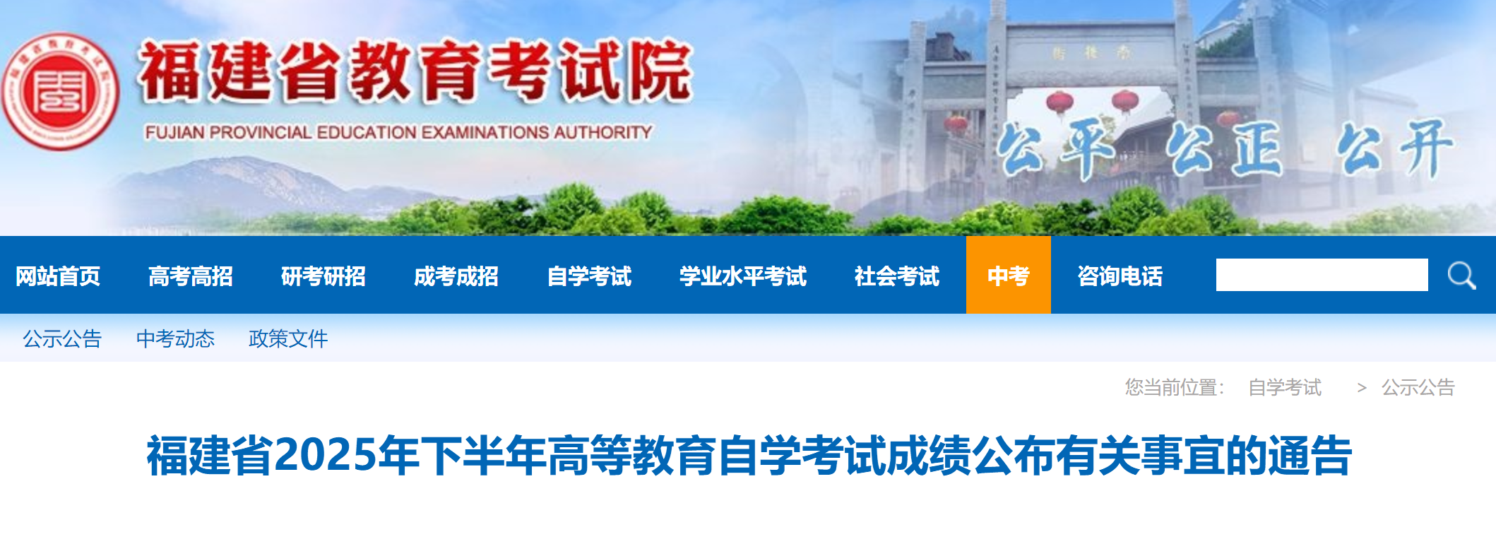 福建省2025年下半年高等教育自学考试成绩公布有关事宜的通告