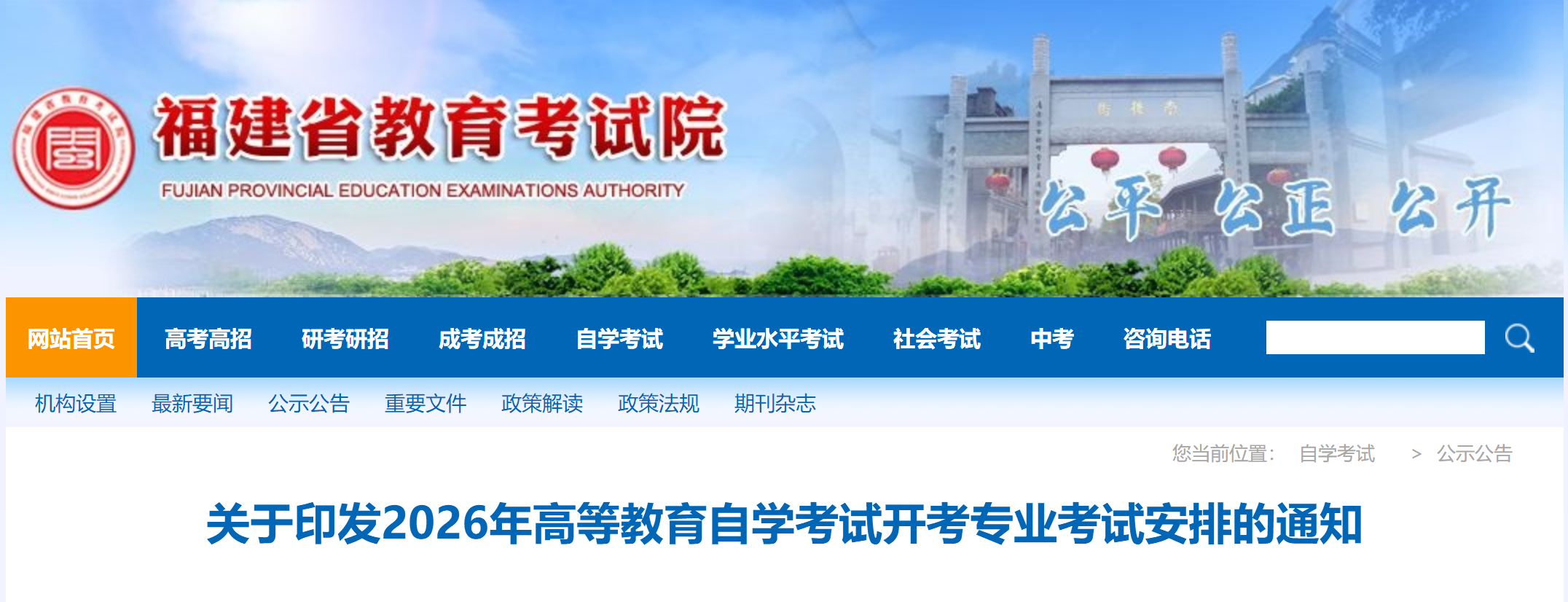 根据教育部教育考试院《2026年高等教育自学考试全国统考课程考试时间安排表》(教考院函〔2025〕85号)要求,现将《2026年福建省高等教育自学考试开考专业理论课程考试安排表》《2026年福建省高等教育自学考试面向社会开考专业实践性考核课程安排表》印发给你们,请做好宣传及报名组织工作。2025-11-22