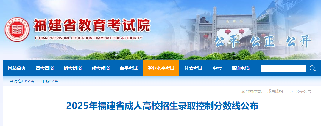 福建省2025年成人高考成绩将于11月11日发布。请相关考生凭账号、密码登录省教育考试院网站(www.eeafj.cn)“数字服务大厅-成考成招-网上报名系统(考生登录)”栏目查询。